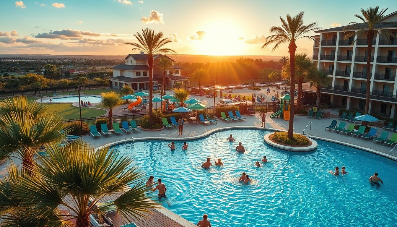 Texas Hill Country resorts like JW Marriott San Antonio and Hyatt Regency Hill Country offer great amenities. They have pools, lazy rivers, sandy beaches, water slides, and kids’ pools. You can also play golf and enjoy stunning views.